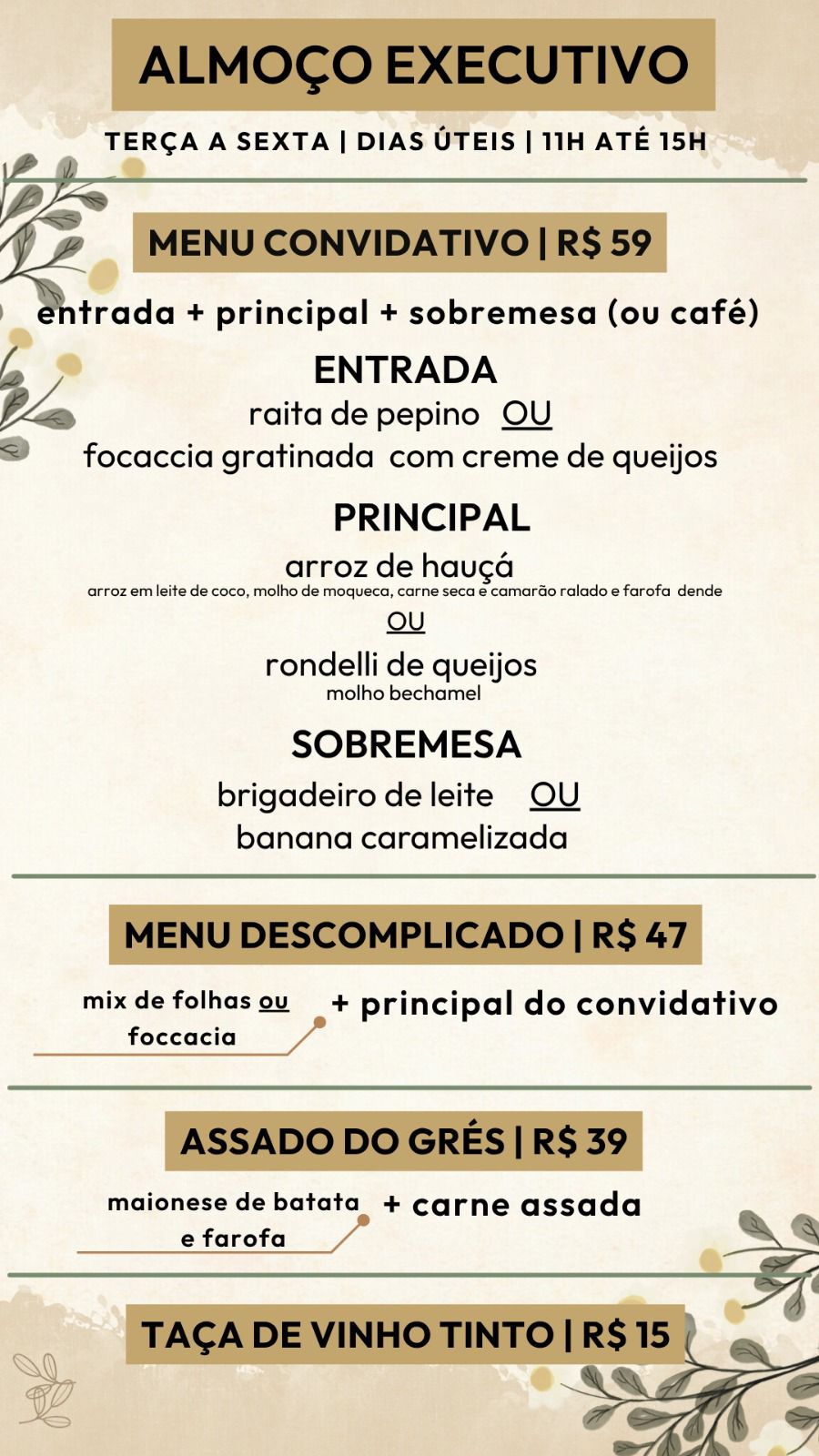 Temos também o menu descomplicado, por R$ 47, com mix de folhas ou focaccia acompanhado do prato principal do dia. E, para quem prefere algo mais direto, indicamos o Assado do Grés, por R$ 39, que traz uma combinação clássica com carne assada, maionese de batata e farofa.